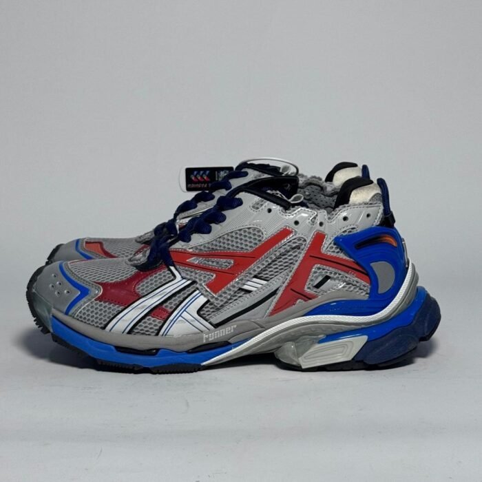 Stand out with the Balenciaga Track Runner sneakers in grey, red, and blue. Featuring a futuristic layered design, breathable mesh, and chunky sole construction, these designer trainers deliver bold style and comfort. Ideal for streetwear, fashion-forward outfits, and statement looks.