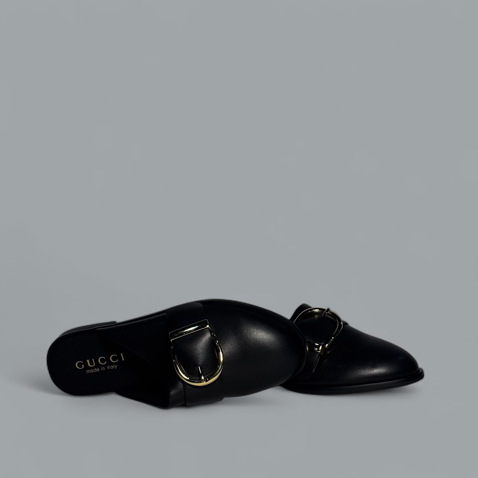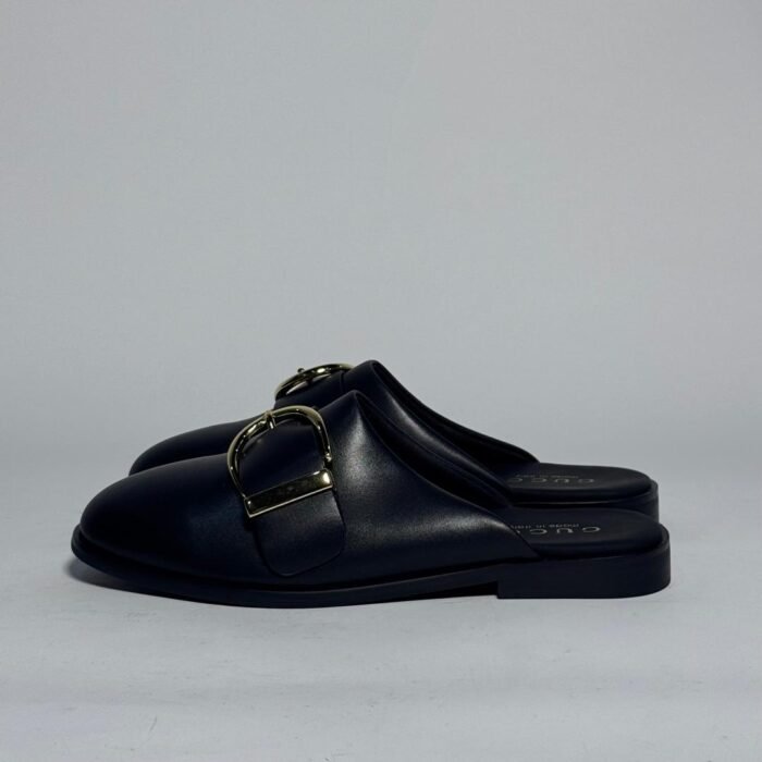 The Gucci Black Leather Mules showcase timeless Italian craftsmanship with a contemporary twist. Designed with smooth leather, a bold gold buckle detail, and a slip-on silhouette, these mules combine luxury with effortless style.