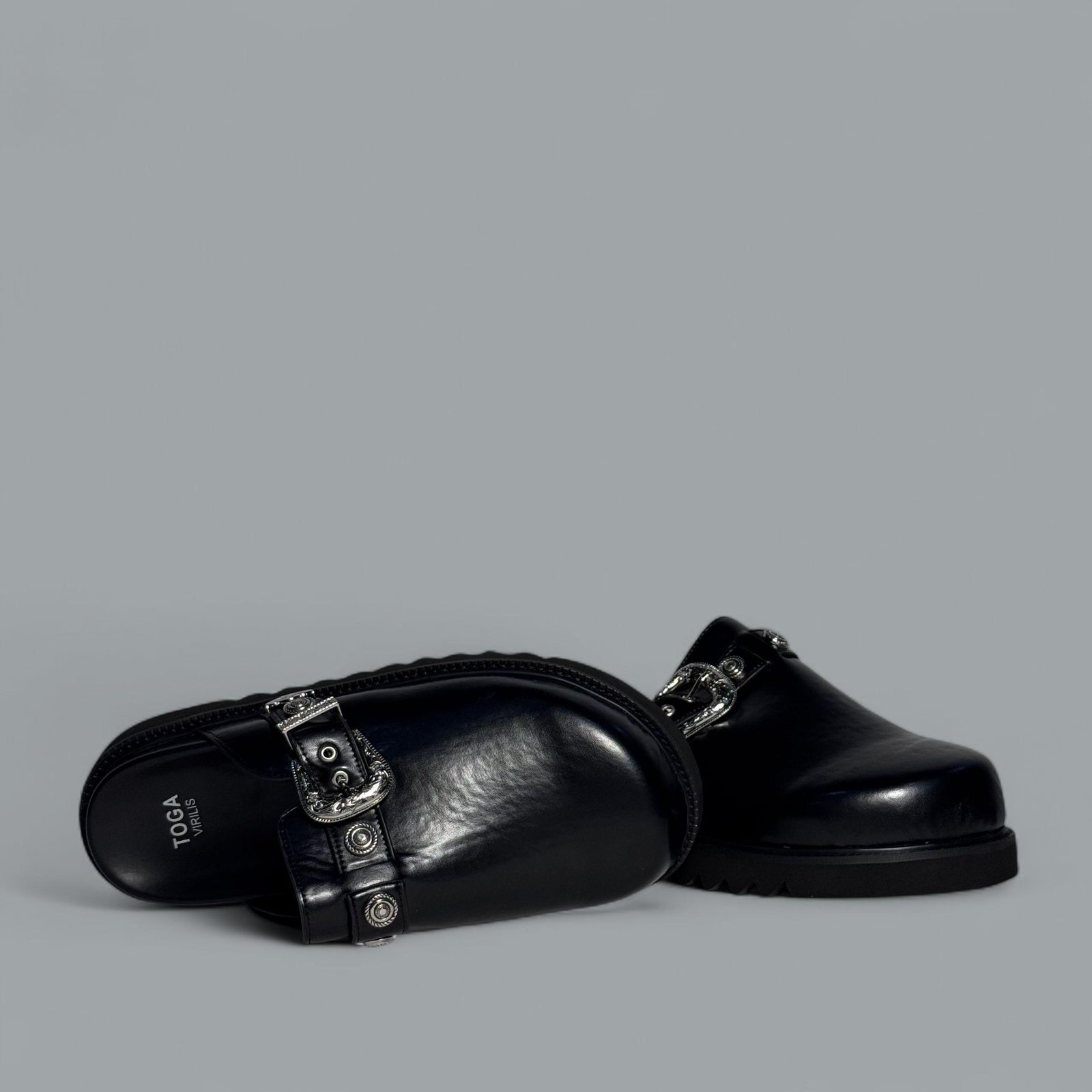 Elevate your footwear collection with these Toga black buckle leather clogs. Featuring bold silver hardware with iconic detailing and a chunky ridged sole, these slip-ons are both stylish and comfortable. Ideal for casual luxury and standout street style.