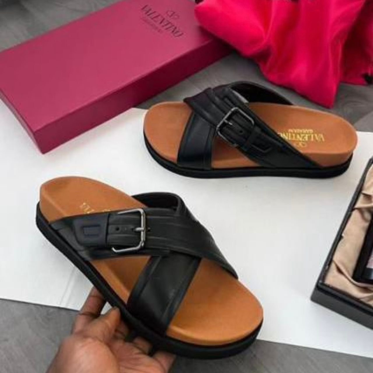Valentino Garavani Crossover Strap Slides – Black/Tan