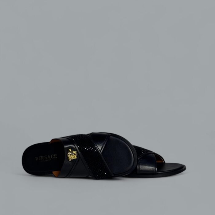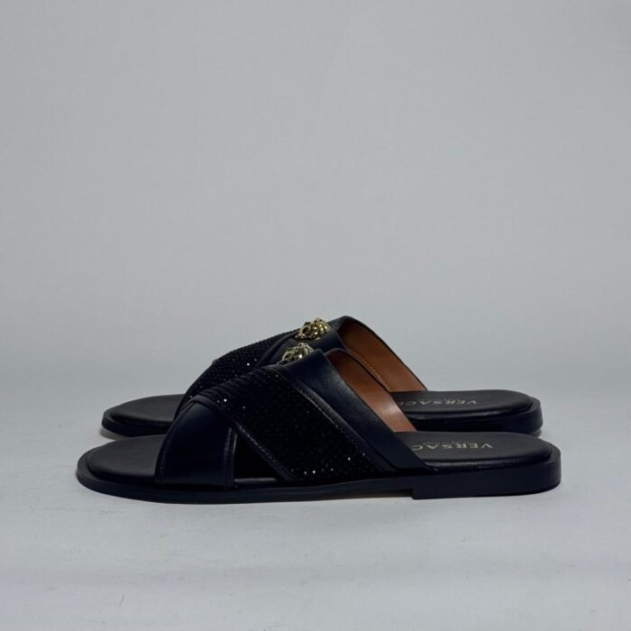 The Versace Medusa Cross-Strap Sandals in Black showcase bold luxury with signature Medusa head detailing. Crafted from premium leather with cross-over straps and stud accents, these sandals are both stylish and comfortable, making them a standout in designer summer footwear.